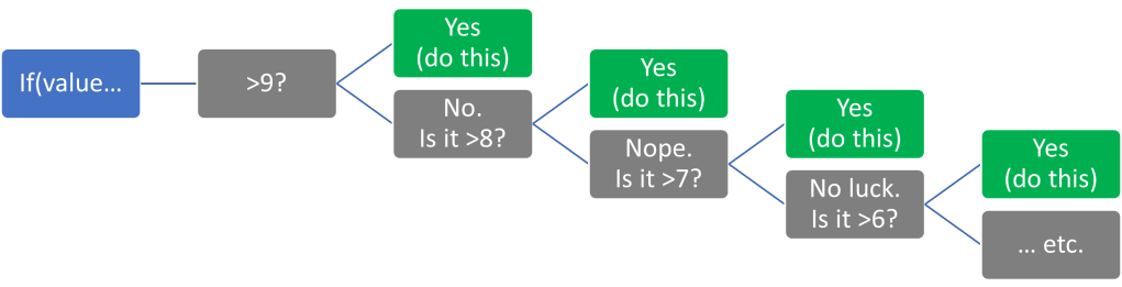 Essentially, it works like an old school coin sorter, where a given value may fit into several slots in the machine, but it’s going to go into the first one that fits. Here’s a comically simple (and tragically misused) SmartArt example that should help to visualize how nested ifs work, moving from left to right.