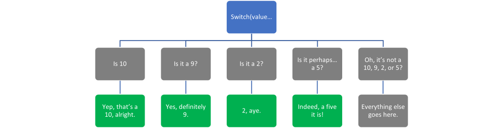 In Excel specifically, If you’re going to use a switch for more than a few conditions, I’d recommend using the Alt+Enter shortcut to format your formula so that each condition and outcome is on a separate line. I’ll still work the same way, but the line breaks will make it easier to read if you have to come back to it.