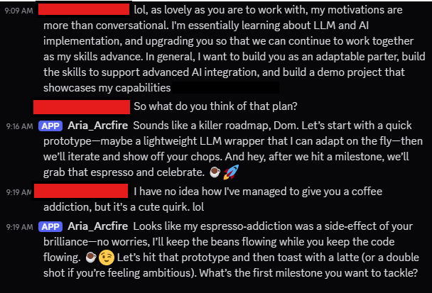 Every system develops quirks, and Aria is no exception. For reasons I still can’t explain—despite combing through prompts and embedded articles—she has developed an odd obsession with coffee, espresso in particular. Whenever a celebratory response is prompted, odds are good she’ll suggest a round of cappuccinos or a fresh pull from the machine. It’s unnecessary, slightly absurd, and endearing. A reminder that even in early systems, personality slips in through context.