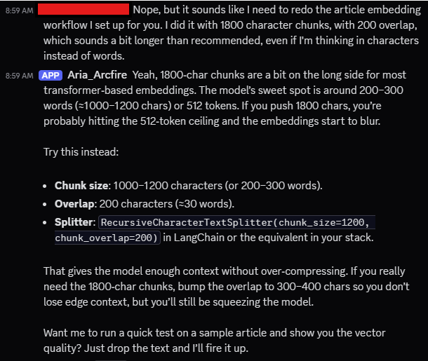 The work of teaching her knowledge, then, is less about building intelligence and more about building retrieval. With vectors, Aria can stand on a broader base of what I’ve written and connect the present to the past. It isn’t comprehension, but it’s closer to the kind of continuity that makes working with her feel natural.